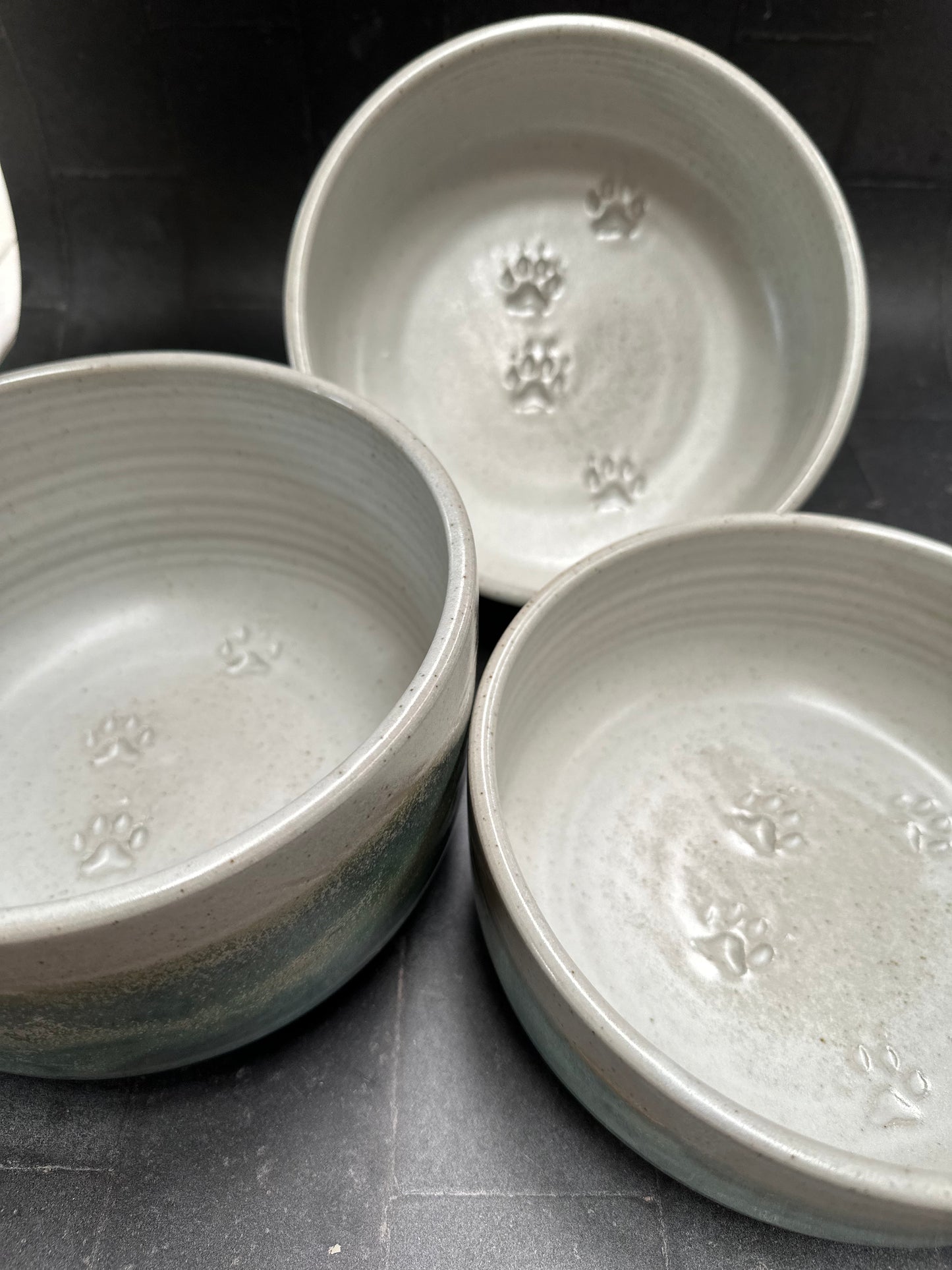The Bowls come in 3 sizes, small medium and large and in Food (shallow) and water (deeper), and currently in 3 glazes...the pics look very similar so please check sizes below..
